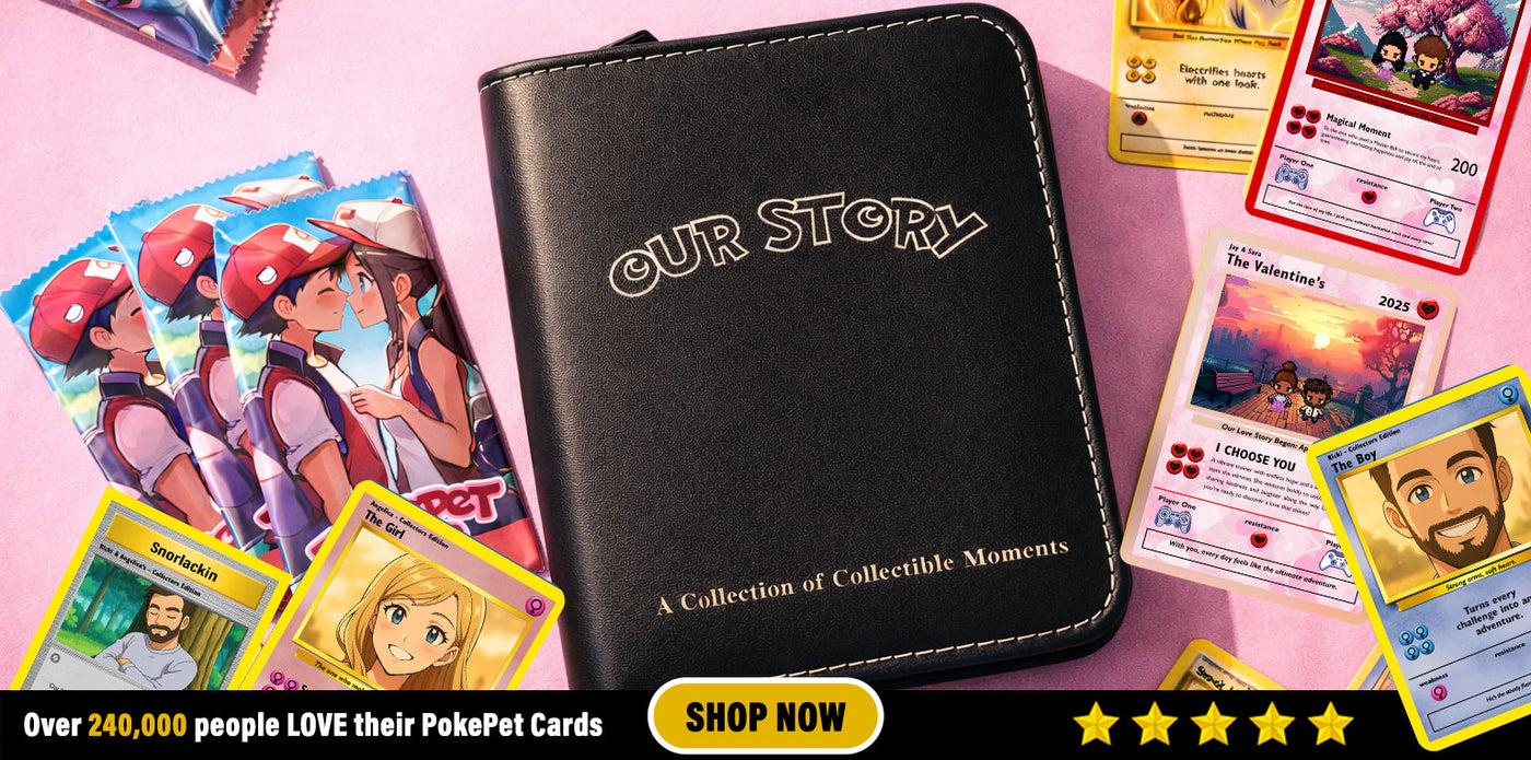 Build a premium PokéPet Couples Binder with up to 40 personalized cards—custom names, traits, moments, and memories.